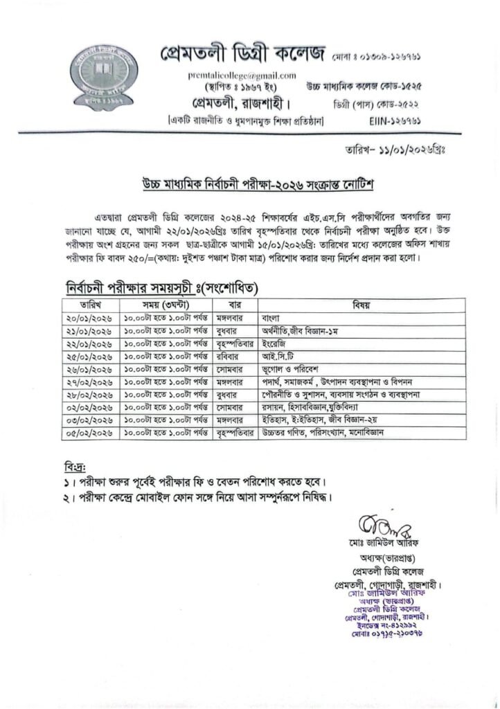 উচ্চ মাধ্যমিক নির্বাচনী পরীক্ষা-২০২৬ সংক্রান্ত নোটিশ (সংশোধিত)
