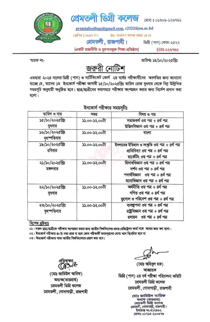 ২০২৪ সালের ডিগ্রি পাস ও সার্টিফিকেট কোর্স ২য় বর্ষের ১ম ইনকোর্স পরীক্ষার রুটিন