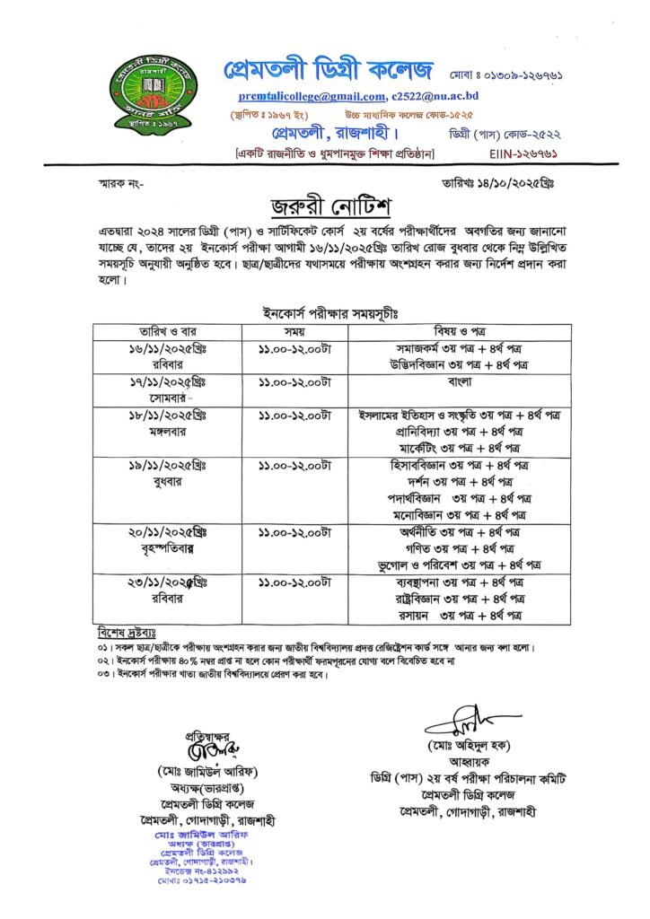২০২৪ সালের ডিগ্রী পাস ও সার্টিফিকেট কোর্স ২য় বর্ষ পরীক্ষার্থীদের ২য় ইনকোর্স পরীক্ষার রুটিন