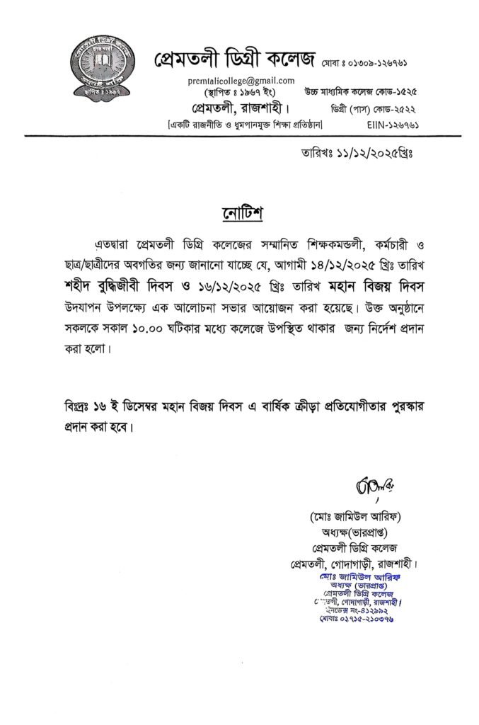 ২০২৪-২০২৫ শিক্ষাবর্ষে ডিগ্রী পাস ও সার্টিফিকেট কোর্স প্রথম বর্ষ ভর্তির নোটিশ।