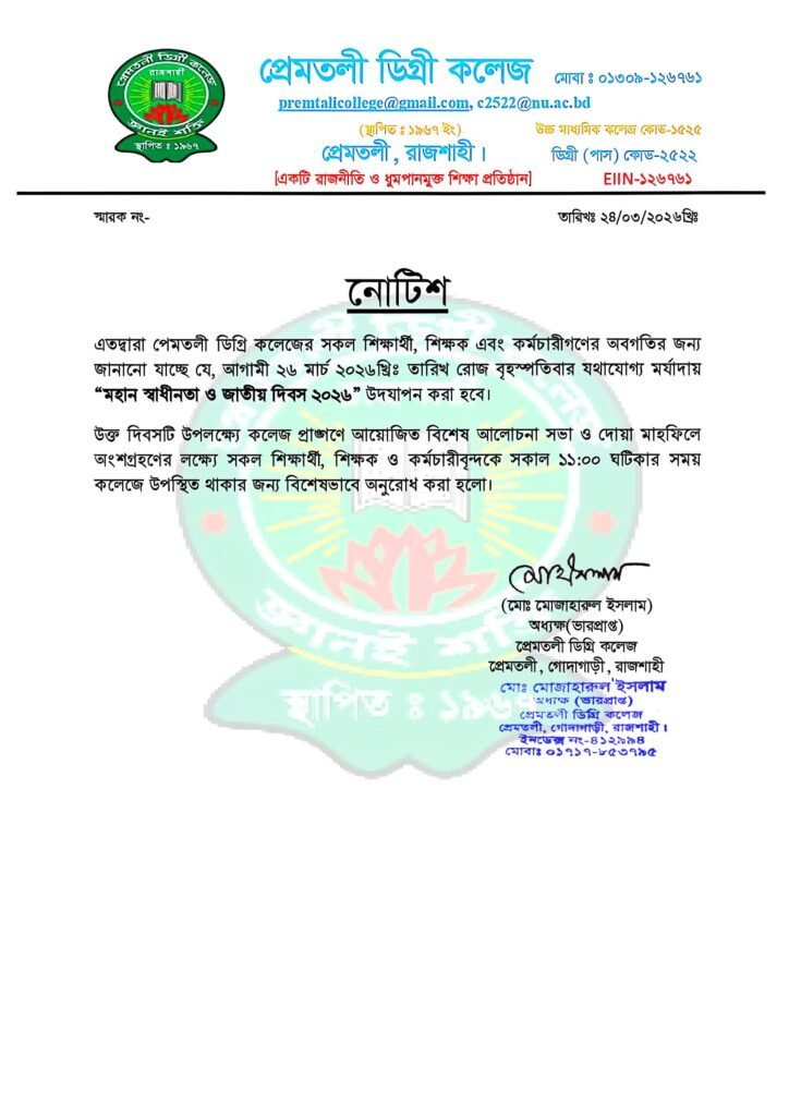 ২৬ মার্চ ২০২৬খ্রিঃ “মহান স্বাধীনতা ও জাতীয় দিবস উদযাপন উপলক্ষ্যে নোটিশ